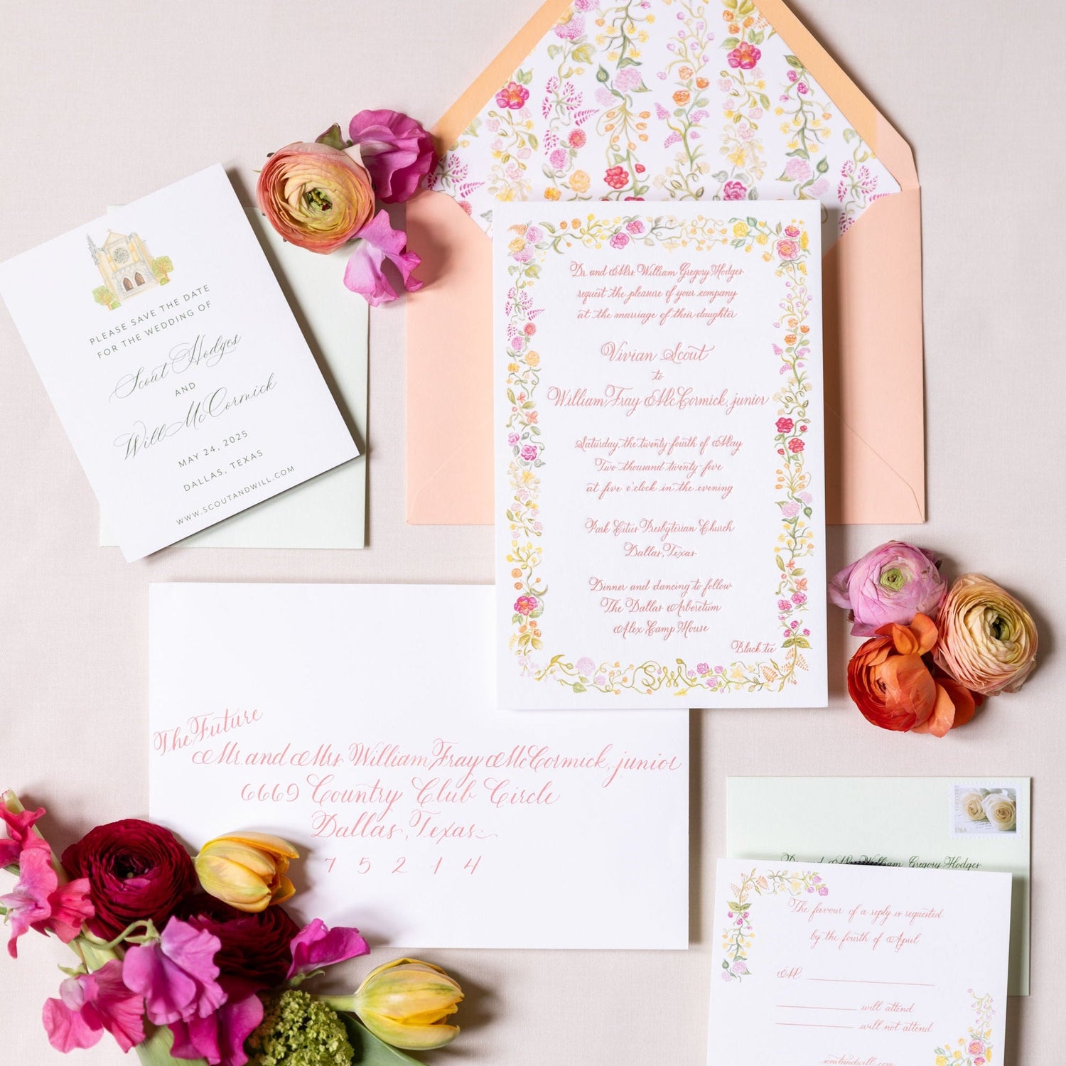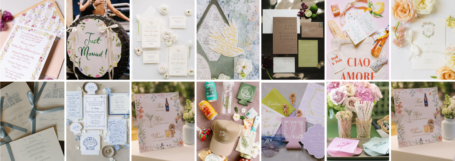 Our invitation suites are custom designed with intentional details to bring your vision to. life. From refined typography and custom calligraphy to layered textures and specialty print methods, every element works together to create a beautiful suite that feels personal to you.