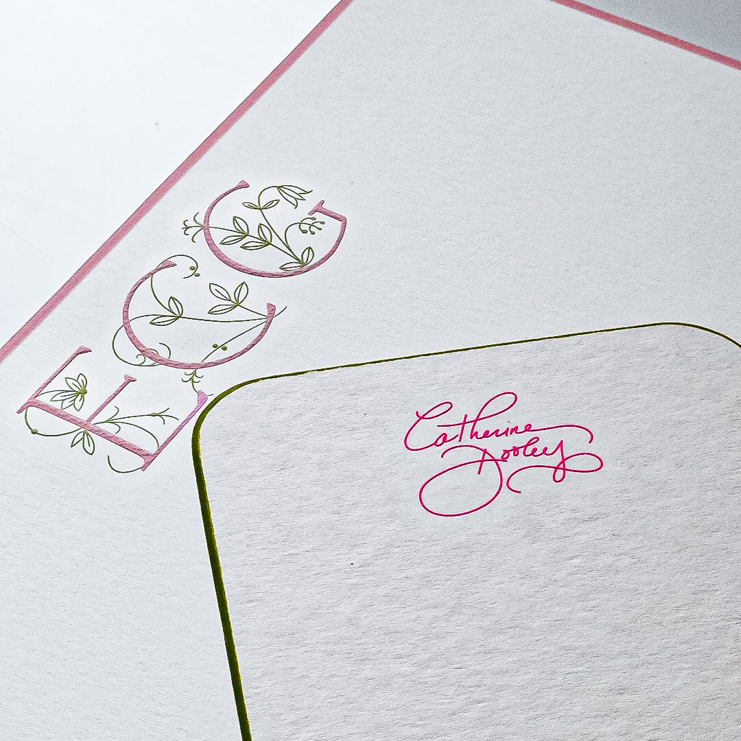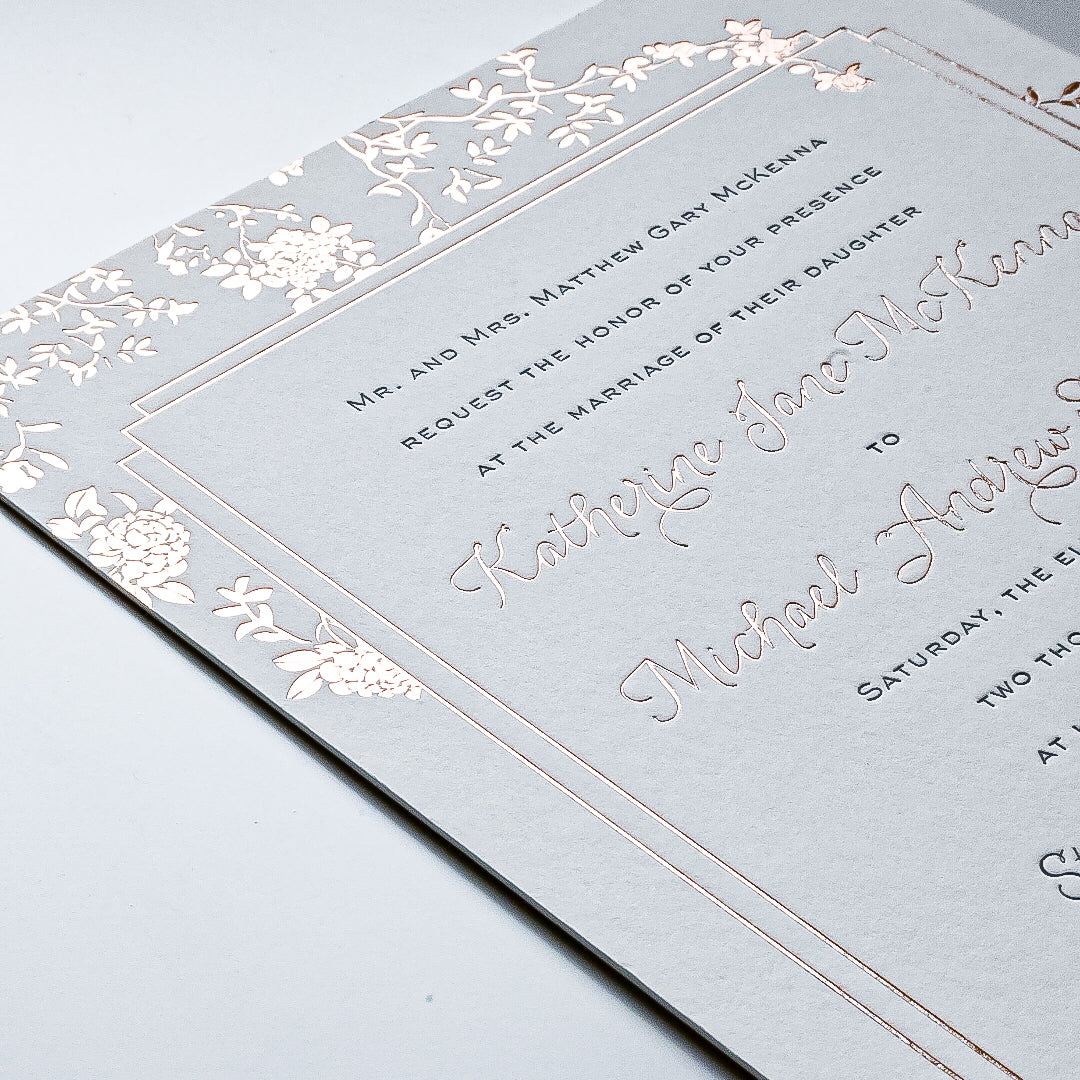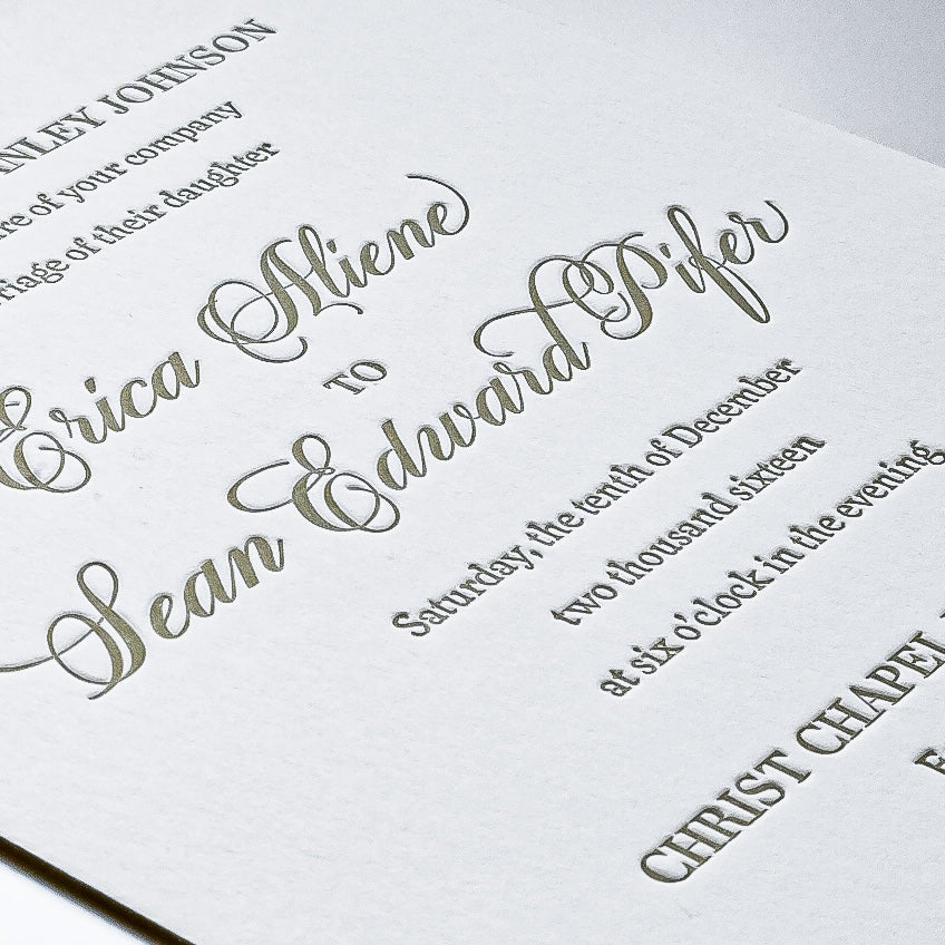 A plate of your design is made and pressed with a foil. Foils can be metallic, brushed or matte.