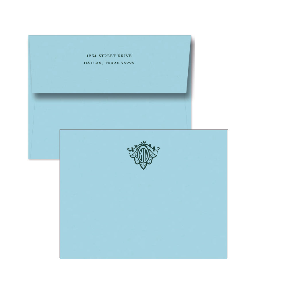 Foil stamped stationery card sets by The Essential Market include personalized cards and envelopes. These stationery cards are colorful and luxurious.