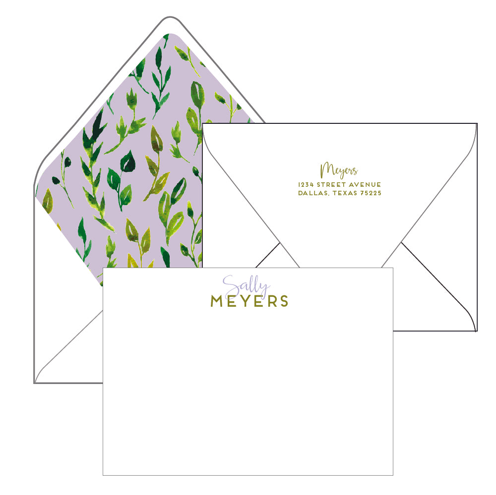 Digitally printed stationery card sets by The Essential Market include personalized cards and envelopes. Make your stationery even more special by adding envelope liners to your order.