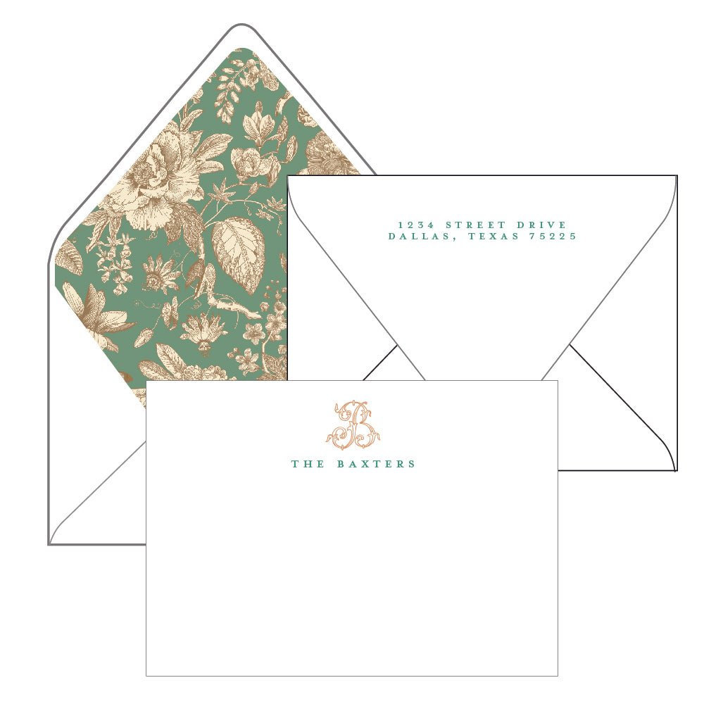 Digitally printed stationery card sets by The Essential Market include personalized cards and envelopes. Make your stationery even more special by adding envelope liners to your order.