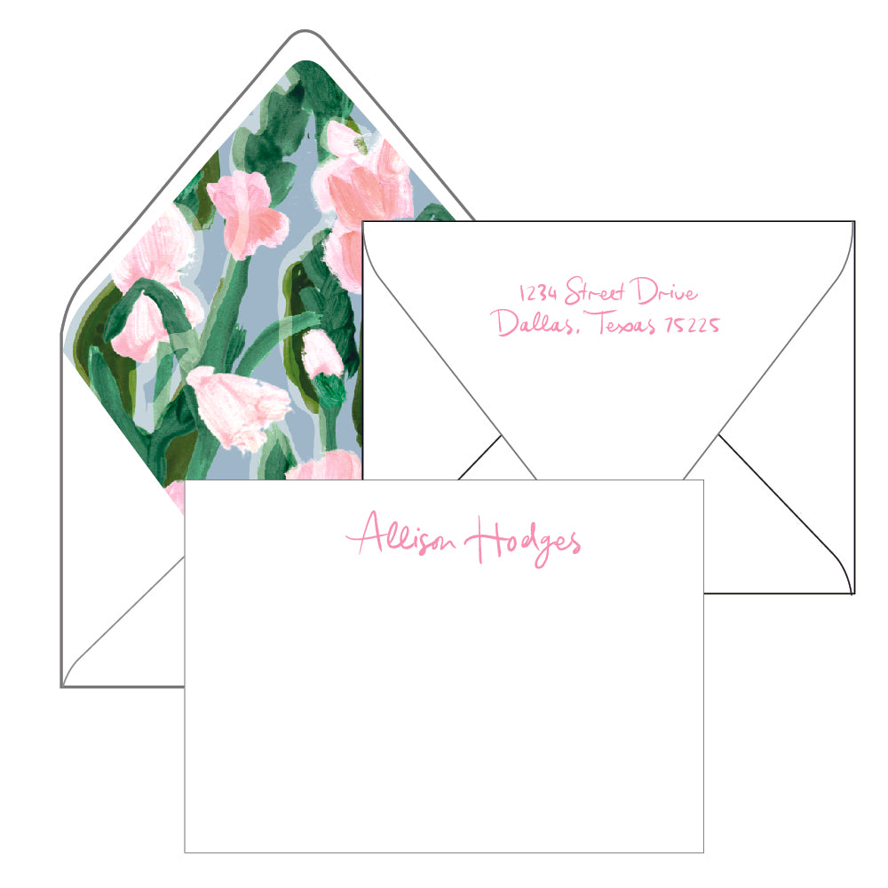 Digitally printed stationery card sets by The Essential Market include personalized cards and envelopes. Make your stationery even more special by adding envelope liners to your order.