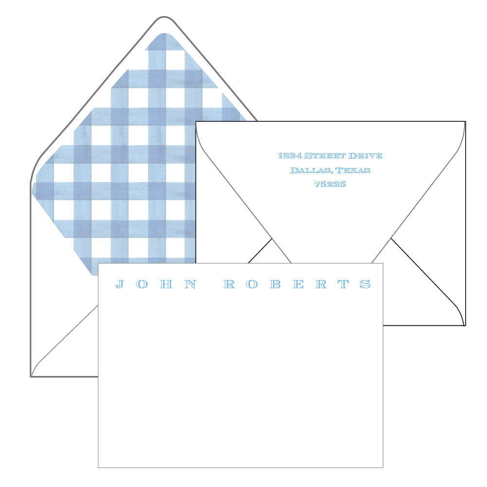 Digitally printed stationery card sets by The Essential Market include personalized cards and envelopes. Make your stationery even more special by adding envelope liners to your order.