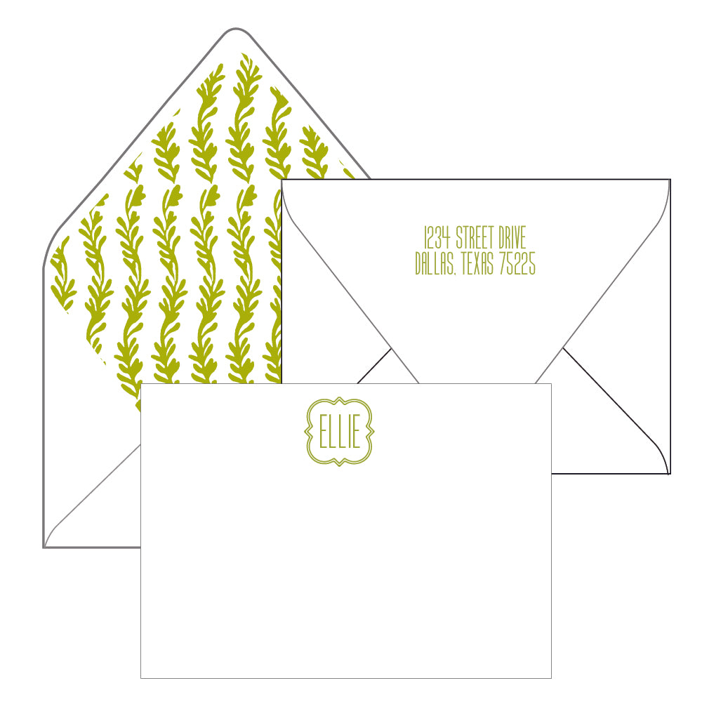Digitally printed stationery card sets by The Essential Market include personalized cards and envelopes. Make your stationery even more special by adding envelope liners to your order.