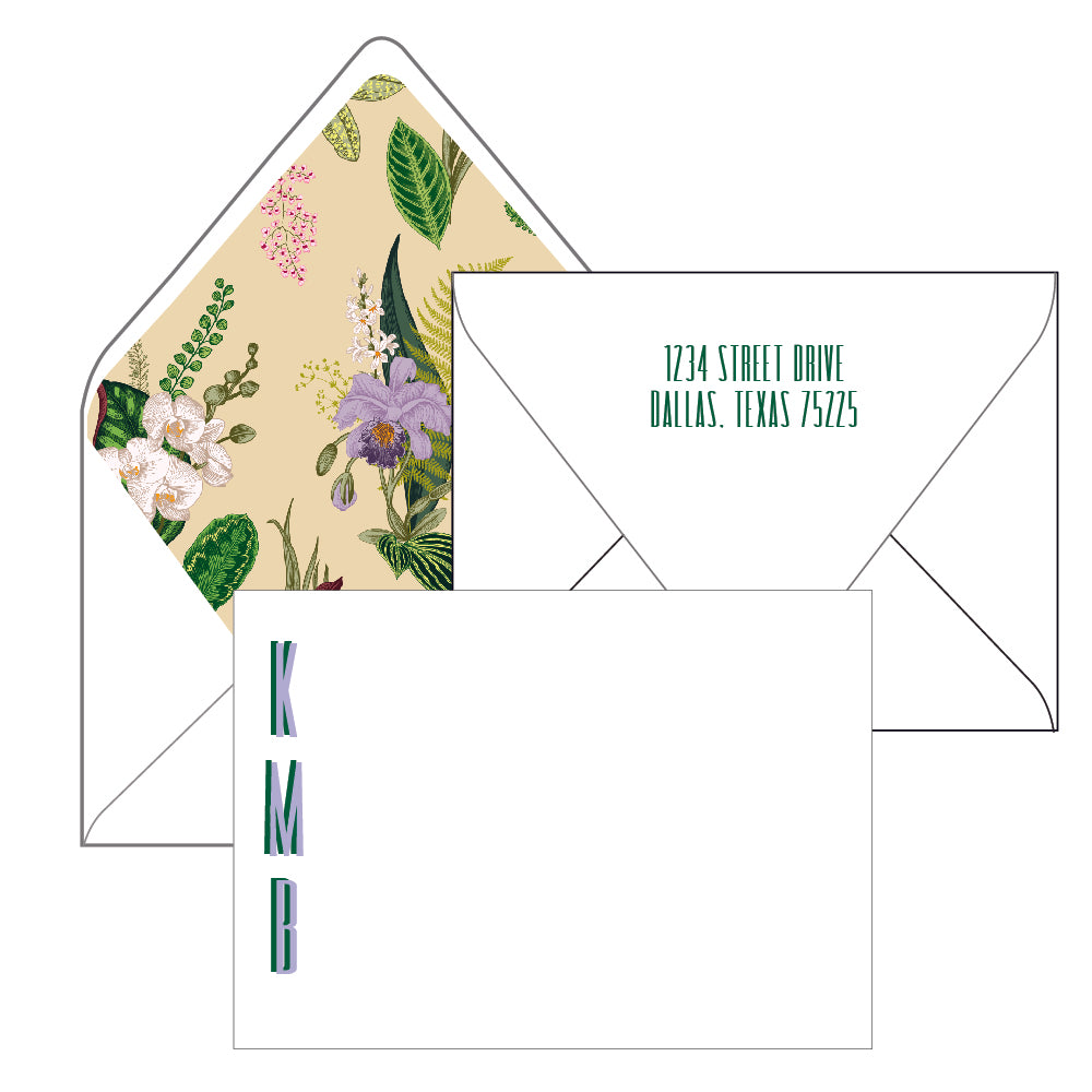 Digitally printed stationery card sets by The Essential Market include personalized cards and envelopes. Make your stationery even more special by adding envelope liners to your order.