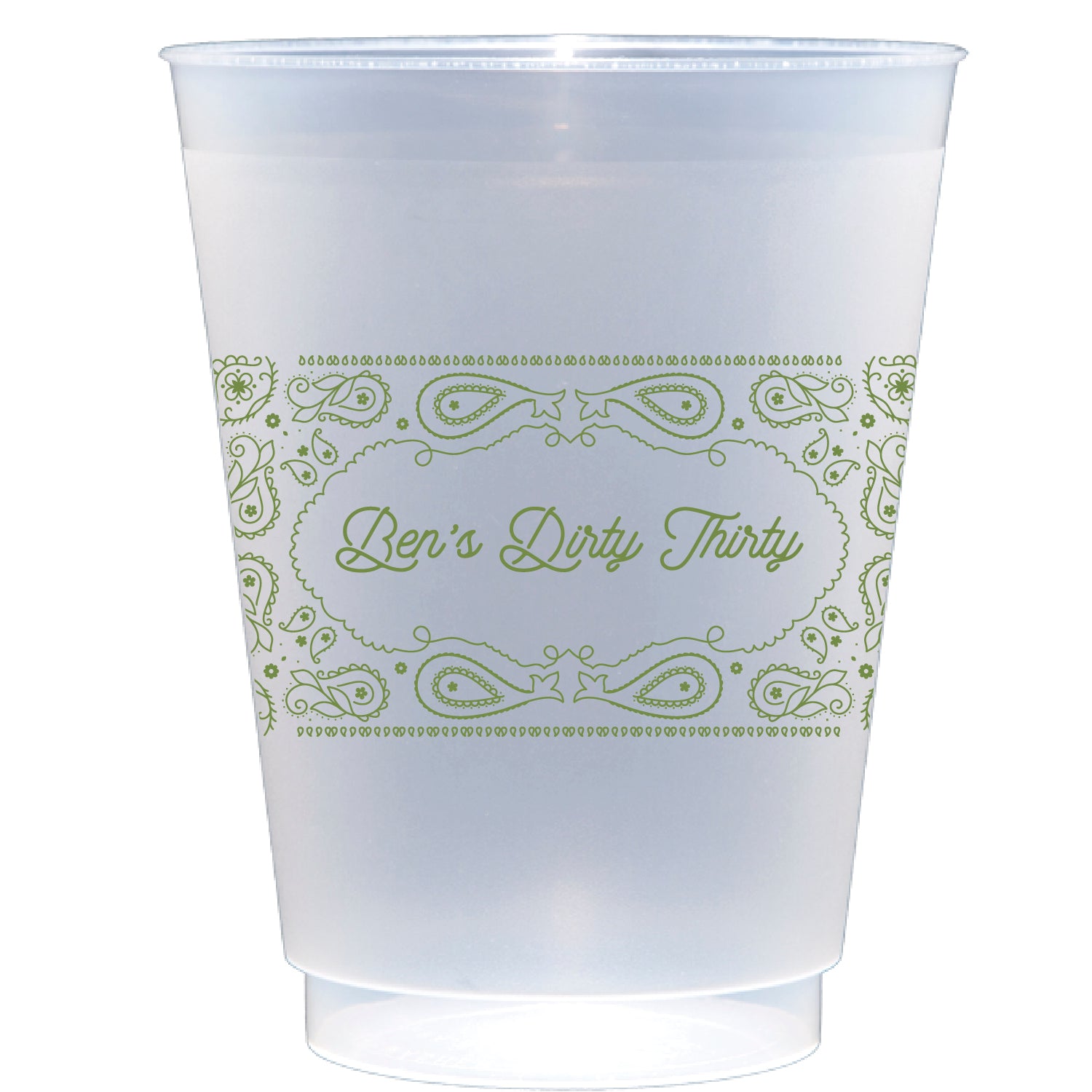 Digital printed shatterproof frosted flex cups available in a variety of sizes and ink colors.