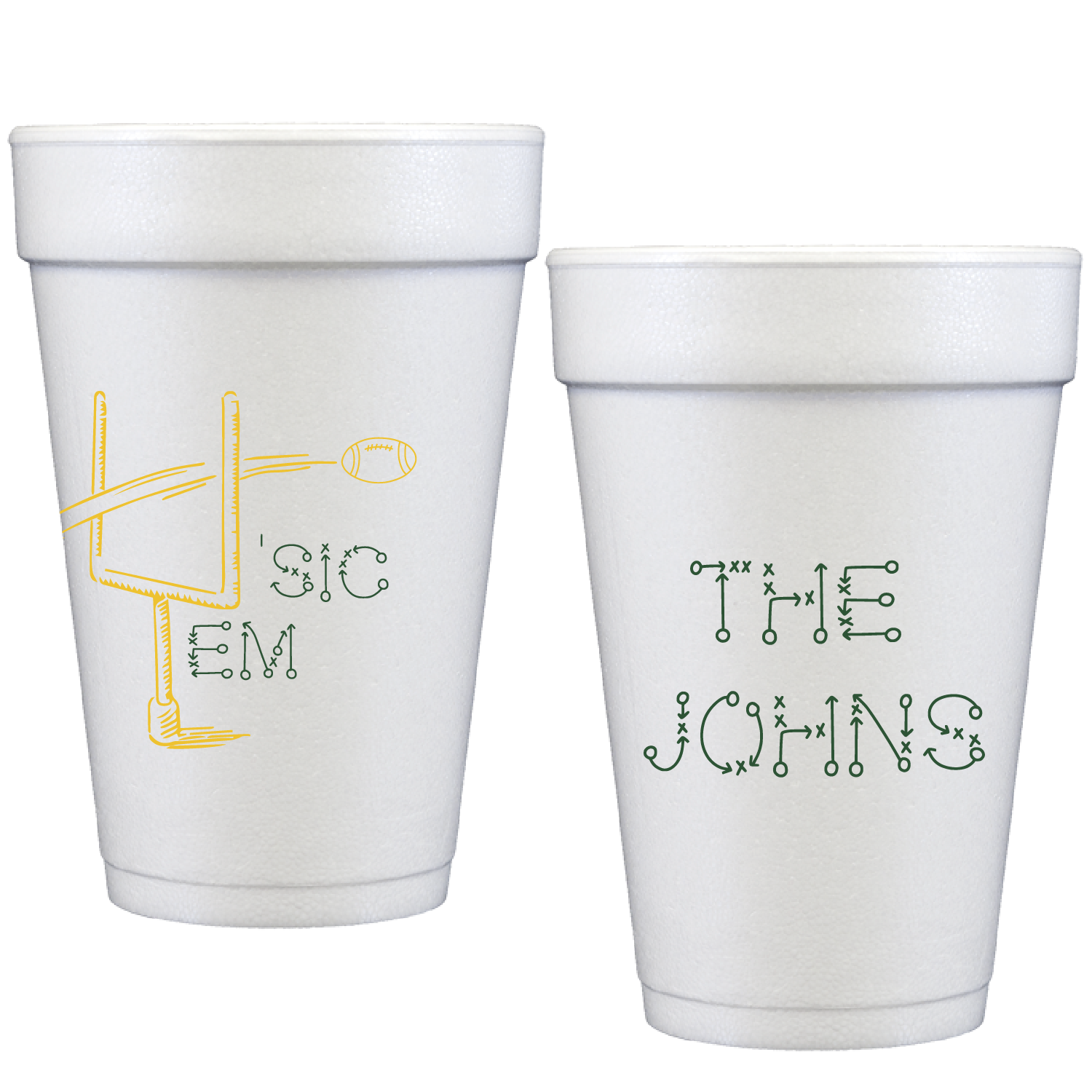 Personalized styrofoam cups are essential for college game days, tailgates, and football season.